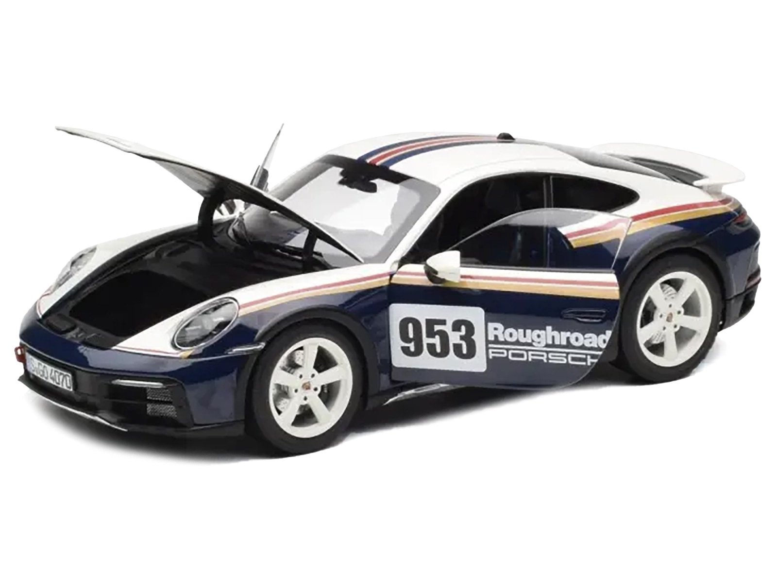 - Brand new 1/18 scale diecast car model of 2023 Porsche 911 Dakar #953 “Roughroads Porsche” Blue and White with Stripes die cast model car by Norev.